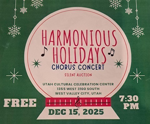 Harmonious Holidays Chorus Concert Basic event infoEvent date: Dec 15 2025 - 7:30pm to 9:00pmLocation: Utah Cultural Celebration Center 1355 W 3100 S, West Valley City, UT 84119 84119 West Valley , UT United States See map: Google Maps Utah US Public event fields The Beehive Statesmen and Wasatch A Cappella will share the stage singing your favorite Christmas and Holiday tunes in the good old fashioned Barbershop Style. This FREE Concert is part of the Utah Cultural Celebration Winter Concert series. Please come and enjoy some Harmonious Holiday music!